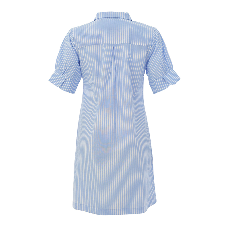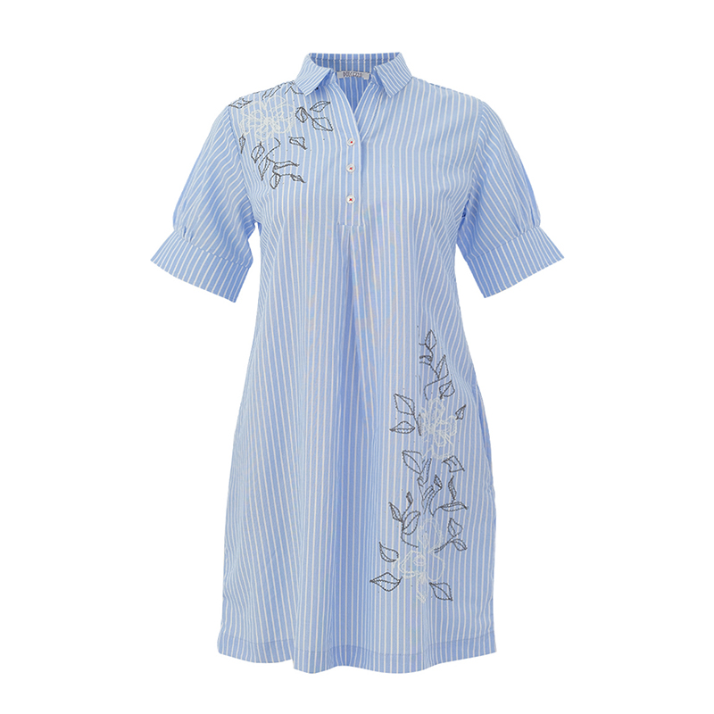 Modèle ample, plis creux au dos et au devant, bleue rayures blanches, motifs de broderie au bas et à l’épaule.