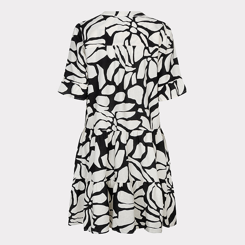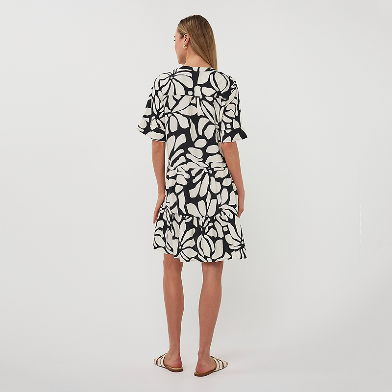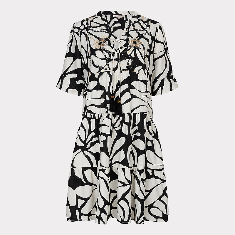 Modèle droit, évasé au bas, broderies or et noir au buste, bel imprimé noir et beige.