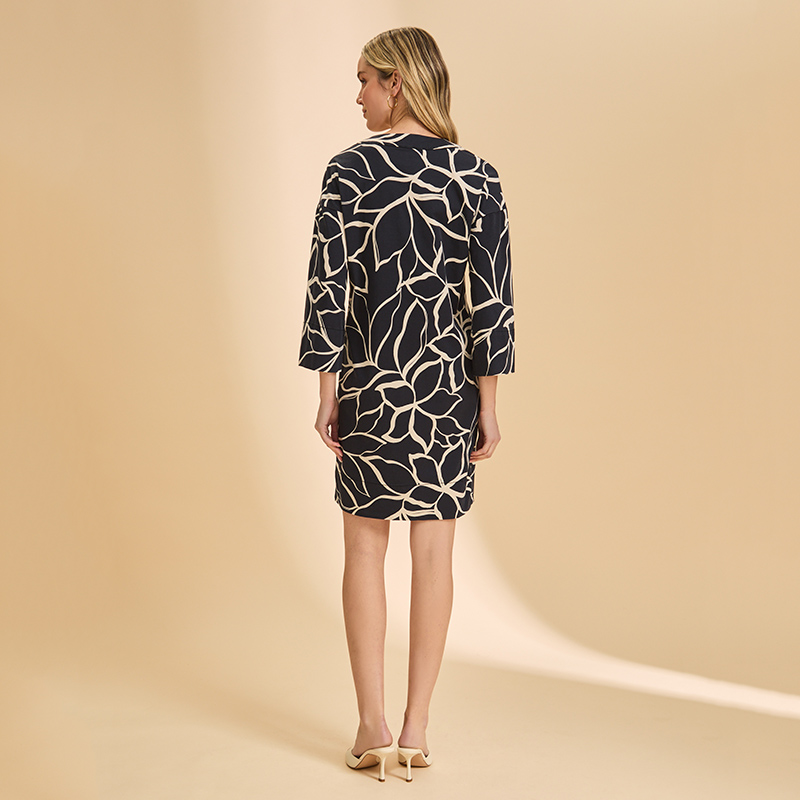 Robe courte à manches 3/4, encolure ronde fini en pointe.