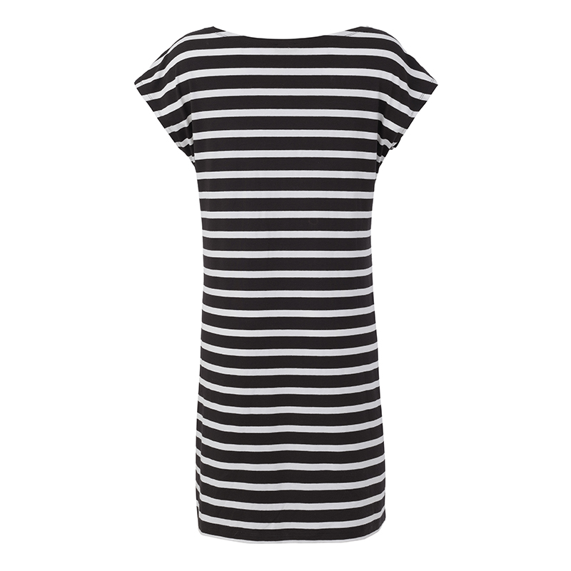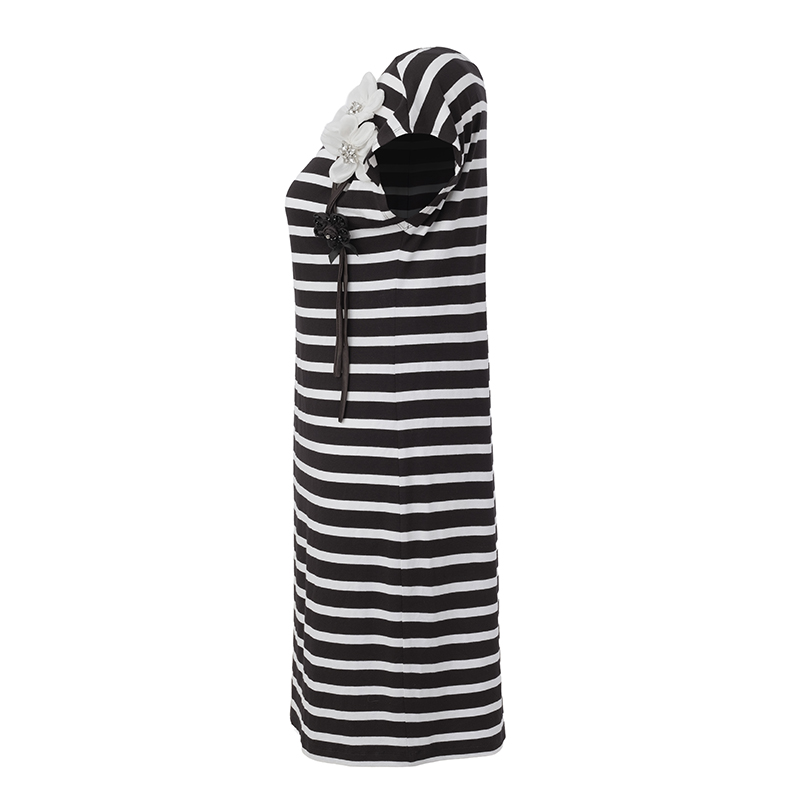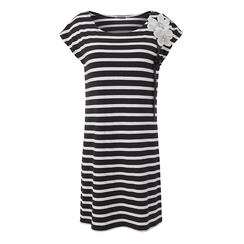 Modèle droit rayé noir et blanc, jolies fleurs en voilage sur une épaule.