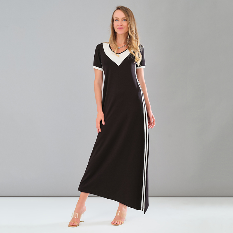 Modèle droit légèrement ajusté noir et ivoire, bandes ivoire sur les manches et les côtés.