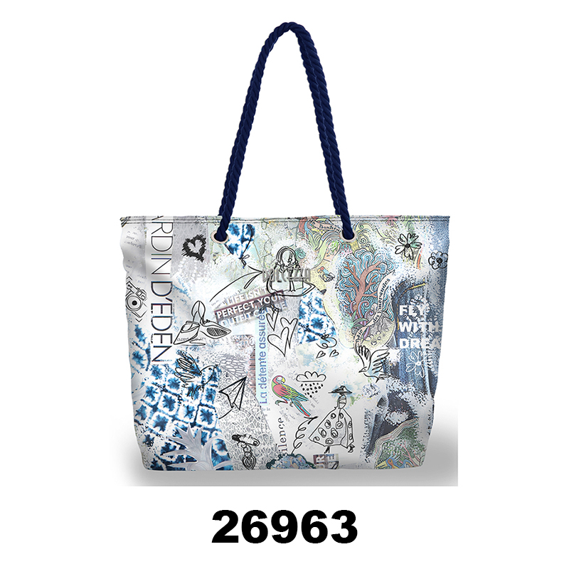Sac fourre tout aux magnifiques imprimés de la saison, ganses en cordon et fermeture éclair.