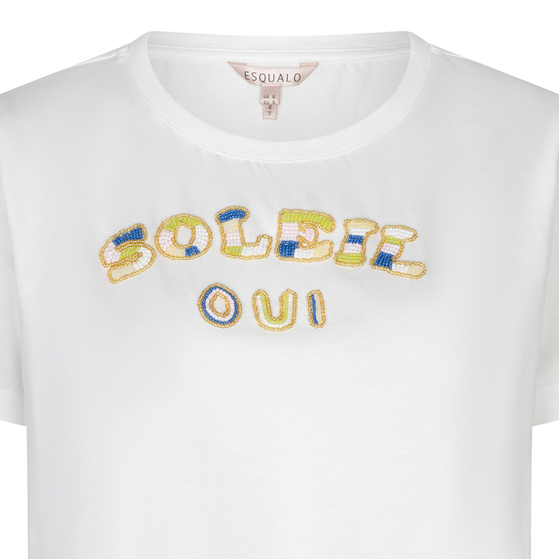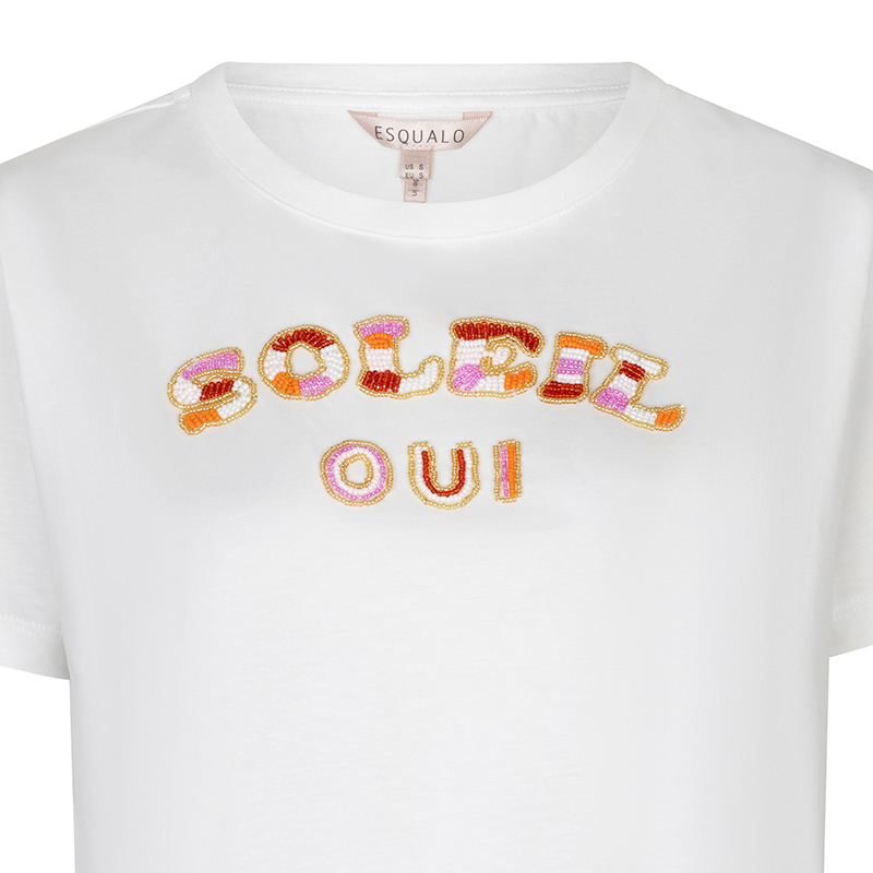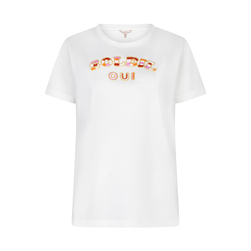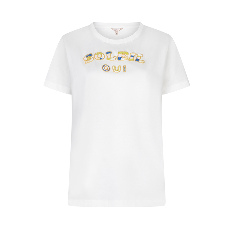 Modèle droit uni signé « Soleil, oui » en petites pierres multicolores, ivoire-rose ou ivoire-vert.