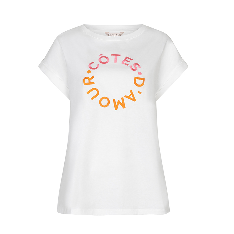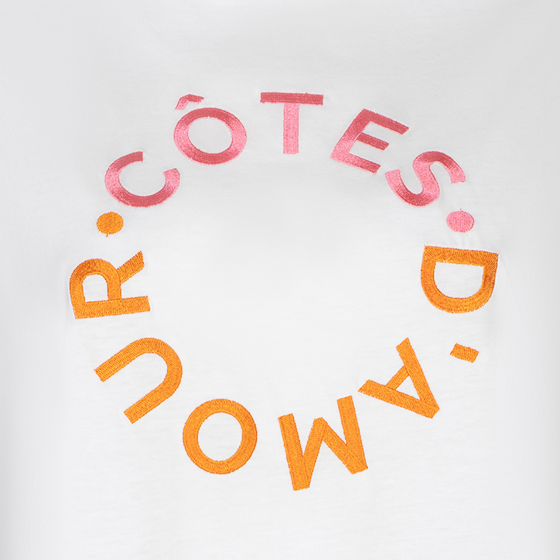 Modèle droit uni avec un motif signé en français « Côtes d’amour » blanc-rose et orange.